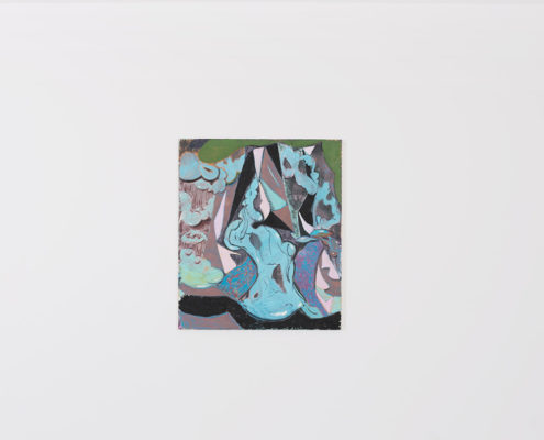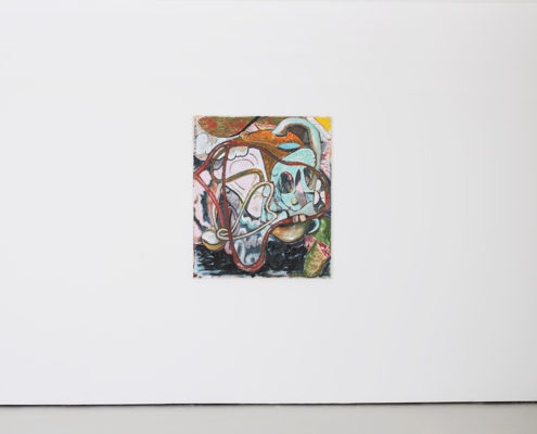 Inspiration comes from a plethora of sources: fly-tipping; studio detritus; trans-humanism and conspiracy theories. Taking found material as source imagery, Jamie abstracts items of garbage into purely compositional forms on canvas that are strewn with abject intestinal imagery. For his project with UNIT9, Jamie draws from one source painting, expanding elements from this ‘host’ work into subsequent paintings. His paintings are exhibited alongside several small sculptures inspired by found material.