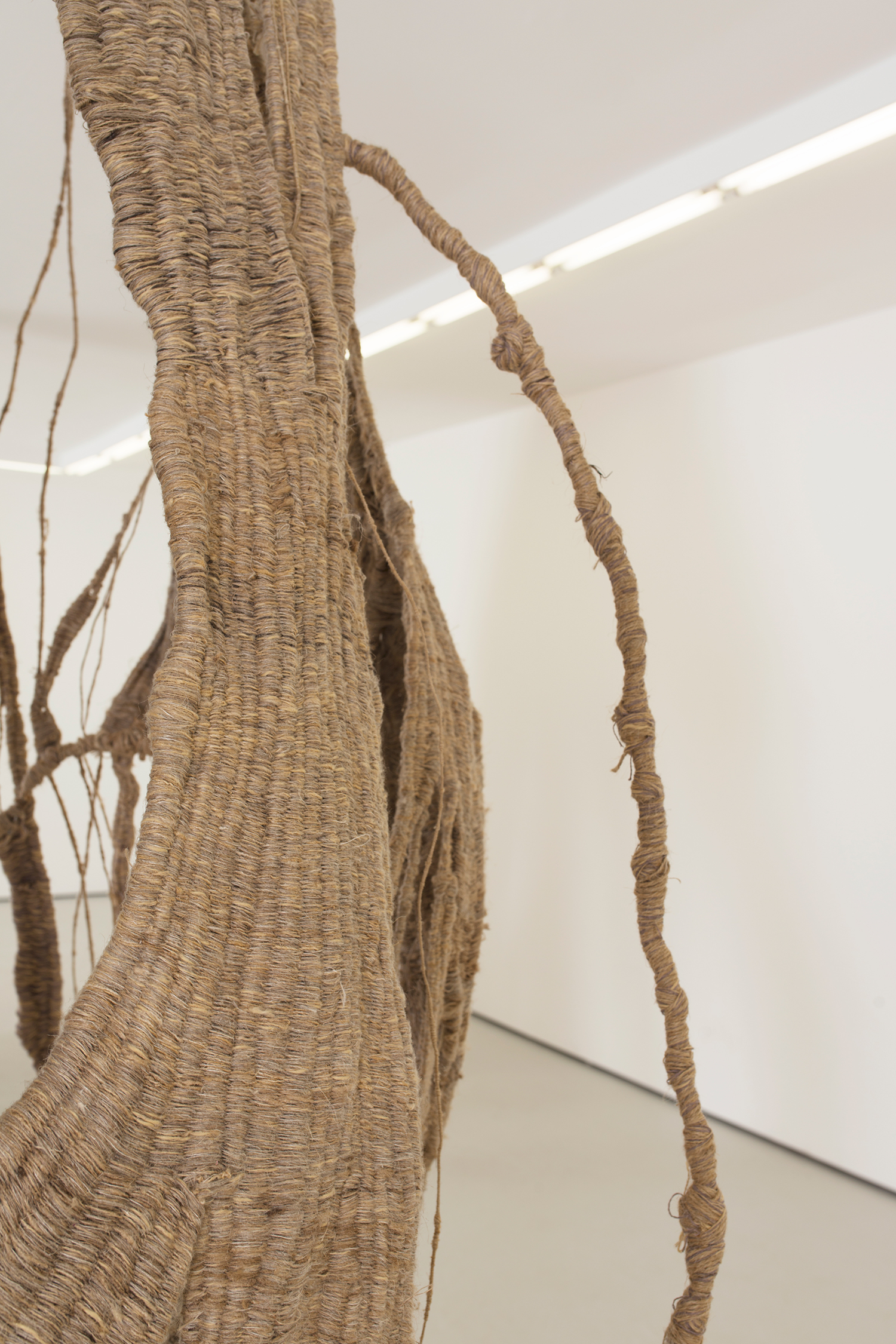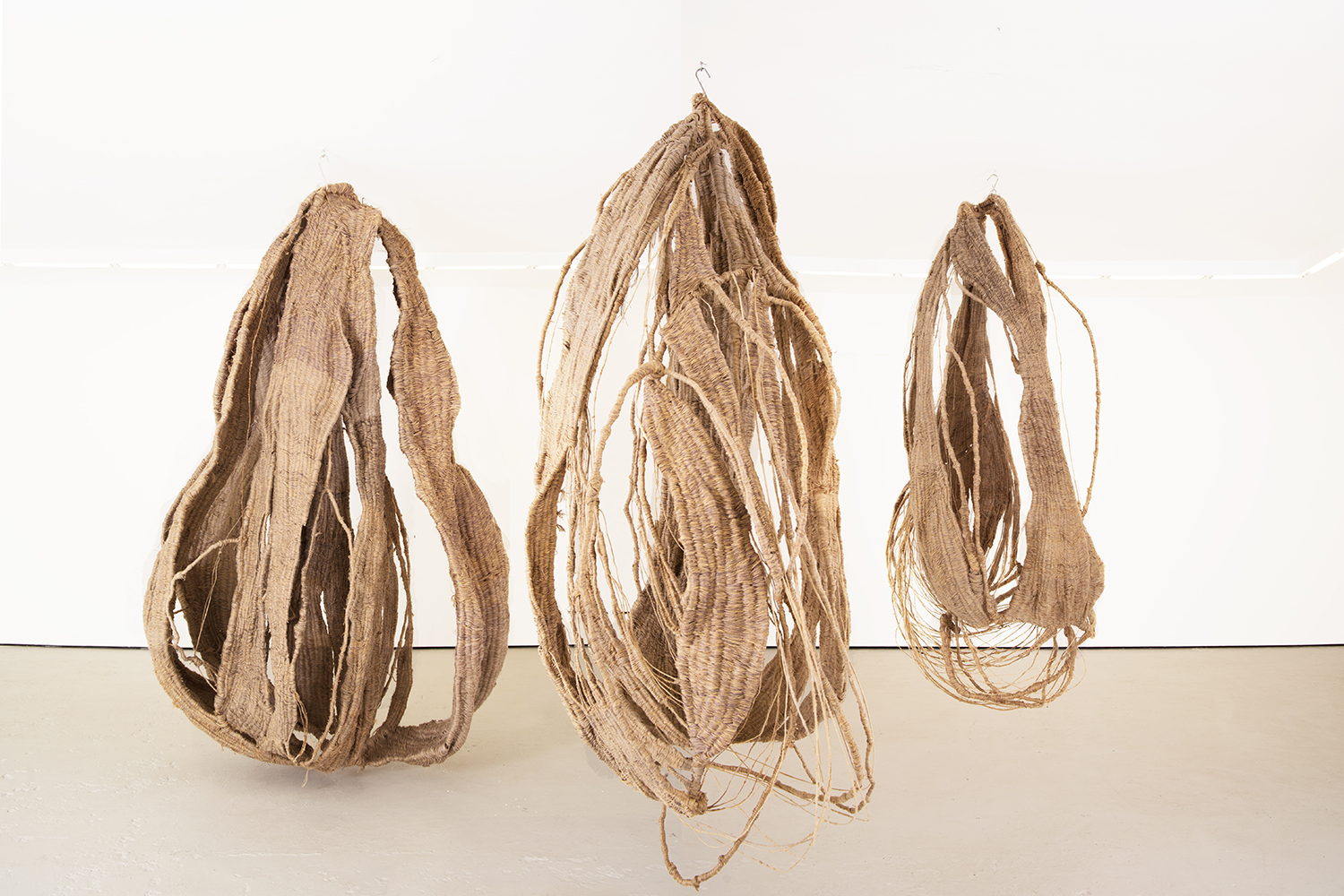 Three large pods woven from linen, cotton, silk and jute are suspended full-height occupying the space of UNIT9, seeming hybrids between organic and alien forms. Reminiscent of giant desert plant pods, insect nests or genitalia, each form is composed in muted colours with an open axis that allows viewers to observe its interior, blurring inner and outer surfaces.